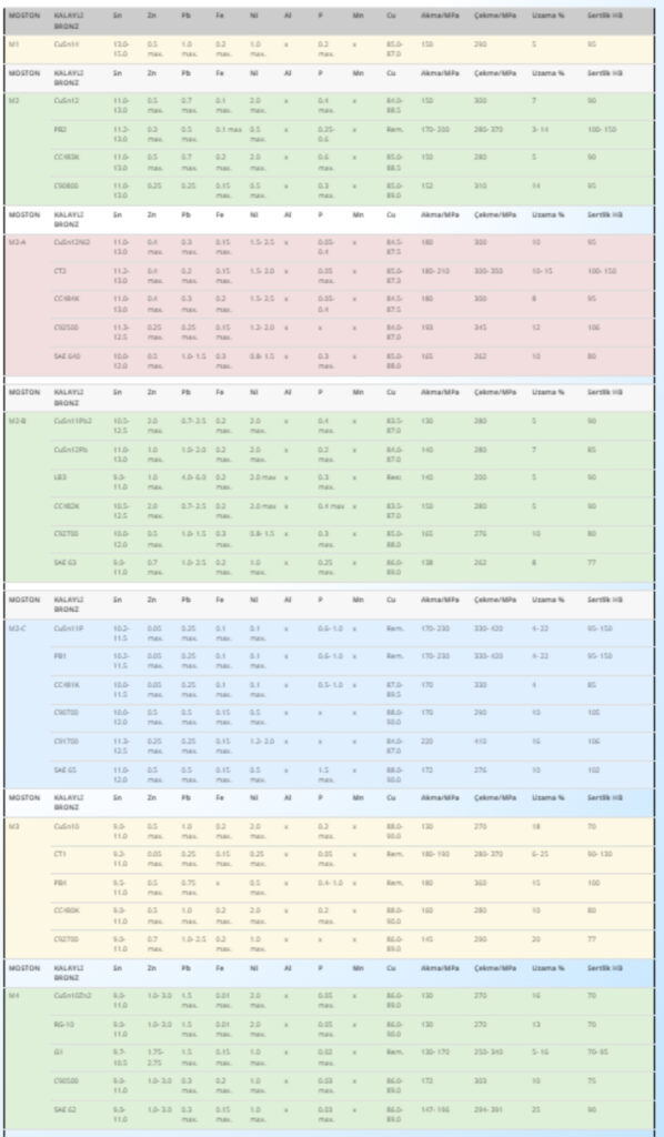 | MOSTON | KALAYLI BRONZ | Sn | Zn | Pb | Fe | Ni | Al | P | Mn | Cu | Akma/MPa | Çekme/MPa | Uzama % | Sertlik HB |